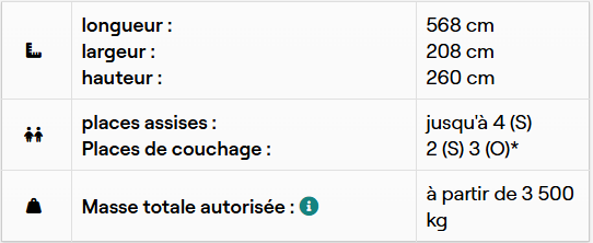 La cuisine fonctionnelle avec réchaud à deux feux, évier et réfrigérateur permet de prendre des repas frais en route, tandis que la salle de bain intégrée avec douche et WC offre une indépendance totale. Pour ceux qui ont besoin d'un espace de couchage supplémentaire, le camping-car peut être complété par un lit dînette en option.